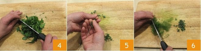Agora prepare as ervas aromáticas que você usará para cobrir as suas borboletas de salmão: pique finamente um punhado de salsa 4, 2 raminhos de tomilho 5 e 2 raminhos de endro 6.