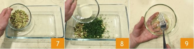Despeje uma picada de pistaches descascados em uma assadeira 7 e junte também a mistura de ervas aromáticas e a farinha de rosca 8, por fim, adicione sal e pimenta a gosto, dessa forma você preparou a farofa. Em seguida, quebre um ovo, elimine a gema e bata levemente a clara 9.