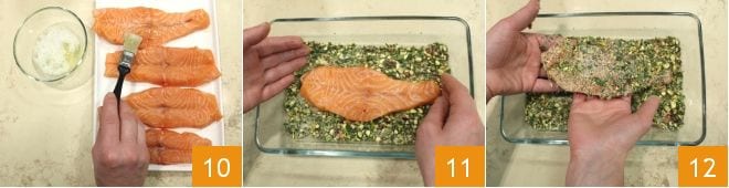 Pincele toda a superfície de cada borboleta de salmão com a clara 10, depois coloque-as na assadeira com a farofa e vire-as de ambos os lados até que fiquem completamente cobertas (11-12). Coloque as borboletas de salmão revestidas em uma bandeja e reserve.