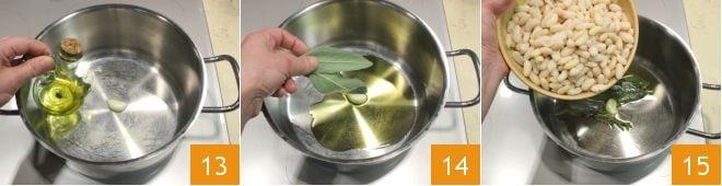 Dedique-se ao creme de cannellini: pegue uma panela grande e aqueça um dente de alho descascado e um fio de azeite extravirgem 13, em seguida adicione a sálvia 14 e o alecrim, deixe fritar por alguns minutos (se quiser, pode retirar o alho depois de temperar o óleo), depois adicione os feijões cannellini previamente demolhados e cozidos 15.