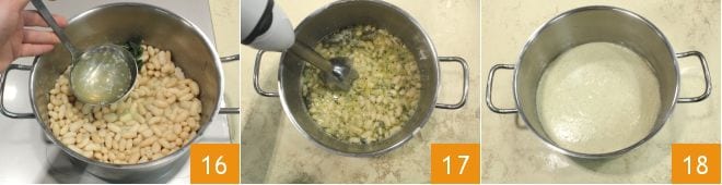 Regue com um par de conchas de caldo de legumes 16, tempere com sal e pimenta e deixe cozinhar por alguns minutos, até que os feijões estejam cremosos e secos. Para descobrir como prepará-lo da melhor forma, consulte nossa Escola de Culinária: caldo de legumes. Neste ponto, retire a panela do fogo e passe a mistura com um mixer de imersão 17 diretamente na panela, até obter um creme liso e denso 18.