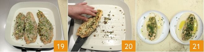 Agora cozinhe as borboletas de salmão: aqueça bem uma grelha ou uma panela larga, este é um passo importante porque bastarão realmente poucos minutos de cozimento em fogo alto para manter a carne macia, alternativamente, você pode cozinhar o salmão em fogo mais baixo, tendo cuidado para não secar demais a carne. Você pode, alternativamente, cozinhar na panela com um fio de óleo. Cozinhe de ambos os lados em fogo moderado até que o exterior esteja dourado (19-20) e o interior permaneça suculento. Agora é só empratar: forme uma cama de creme de cannellini no prato de servir e coloque a borboleta de salmão por cima, finalize com um raminho de endro, uma pitada de tomilho e um fio de azeite cru 21. Sirva o seu salmão crocante sobre creme de cannellini e aprecie bem quente!