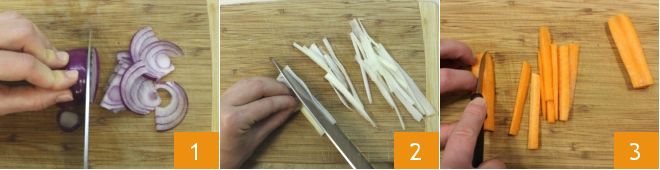 Para realizar o salmão em carpione, certifique-se de ter comprado salmão norueguês; caso contrário, recomenda-se congelá-lo por pelo menos 96 horas a -18 graus e depois descongelá-lo para utilizá-lo na receita. Em seguida, pegue a cebola, descasque-a e divida ao meio, coloque a parte plana de uma metade em uma tábua e fatie-a no sentido do comprimento 1. Lave bem o aipo sob água corrente e elimine as folhas externas, laterais e do topo. Elimine a membrana fibrosa externa com um descascador de legumes. Divida o aipo ao meio e corte em tirinhas 2. Descasque a cenoura e depois corte-a em tiras finas no sentido do comprimento 3.