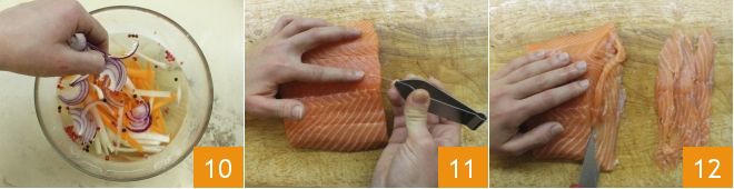 e a cebola 10, misture com uma colher de pau para dar sabor aos ingredientes. Agora cuide do salmão: é fundamental que o salmão seja fresco e, principalmente, certifique-se com seu fornecedor que ele foi "abatido", ou seja, congelado na temperatura correta. Limpe o filé removendo as espinhas com uma pinça de cozinha 11 e depois corte o salmão em tirinhas finas 12.