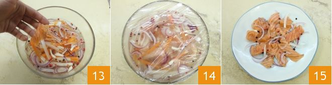 Coloque os pedaços de salmão no carpione 13, cubra a tigela com filme plástico 14. Deixe marinar o salmão na geladeira por pelo menos 2 horas. Após o tempo necessário, o peixe terá absorvido os aromas da marinada e você poderá saborear seu salmão em carpione com julienne de legumes 15.