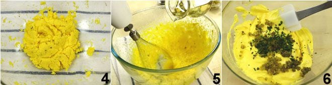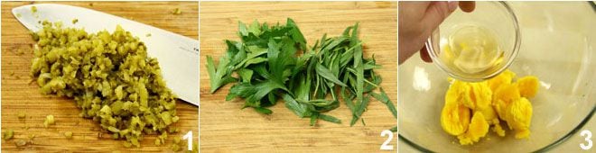 Para preparar o molho tártaro, comece cozinhando 4 ovos. Enquanto isso, pique finamente com uma faca os picles e as alcaparras 1, pique também a salsa e o estragão 2. Separe as gemas cozidas dos ovos e coloque-as em uma tigela, adicione o vinagre de vinho branco 3, uma boa pitada de sal e uma moagem de pimenta-do-reino.