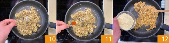 Aromatize a massa das salsichas veganas com o tomilho fresco 10 e a páprica doce 11. Neste ponto, adicione a farinha de grão-de-bico 12