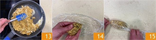 Misture bem os ingredientes, mexendo bem e cozinhando em fogo baixo por mais 4 minutos 13. Uma vez que a massa das salsichas estiver morna, retire 100 gramas, dê a forma de uma salsicha e coloque sobre um pedaço de filme plástico 14. Enrole a salsicha para dar melhor forma e feche as duas extremidades. Com a ajuda do filme plástico, crie a forma de uma salsicha 15 e deixe-as compactar na geladeira por 1 hora.
