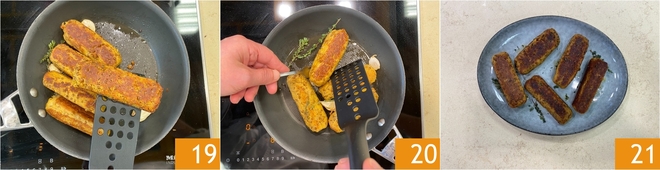 Cozinhe as salsichas por cerca de 10 minutos em fogo médio 19, virando-as delicadamente, tomando cuidado para não quebrá-las 19. Uma vez douradas de todos os lados, as salsichas veganas estarão prontas para serem servidas 21!