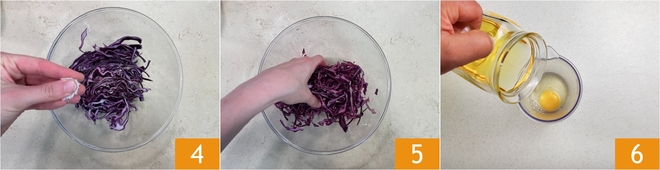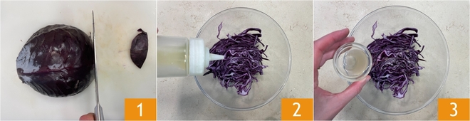 Para preparar o hambúrguer com bife de abóbora, comece limpando o repolho: remova primeiro as folhas externas e depois fatie-o finamente em tiras 1. Transfira o repolho para uma tigela e tempere com óleo 2 e vinagre 3.