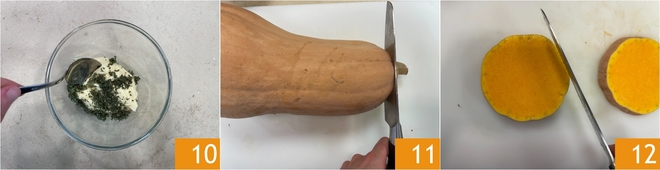 Misture e guarde na geladeira 10. Dedique-se agora aos bifes: corte as extremidades da abóbora 11, obtenha fatias de aproximadamente 1,5 cm de espessura 12 e remova a casca; você precisará de cerca de 500 g de abóbora limpa.