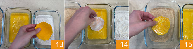 Passe as fatias de abóbora primeiro na farinha 13, depois nos ovos batidos 14 e, por último, na farinha de rosca 15.