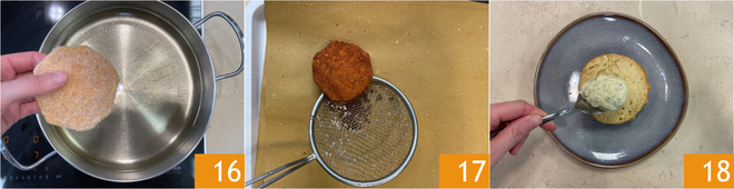 Imersa um bife de cada vez no óleo quente a 165º-170º 16 e frite por alguns minutos; quando estiverem bem dourados, escorra em papel absorvente 17. Você está pronto para montar seu sanduíche: espalhe um pouco de maionese na parte inferior do pão 18,