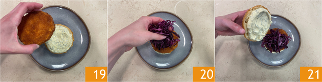 Coloque o bife por cima 19, depois adicione um punhado de repolho marinado e bem escorrido 20. Feche com a outra metade do pão, sobre a qual você espalhou mais um pouco de maionese, e está pronto o seu sanduíche com bife de abóbora 21!
