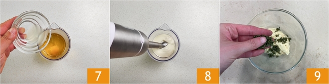 Adicione também o vinagre 7 e ligue o mixer de imersão até obter a consistência de uma maionese 8. Adicione a sálvia picada 9.