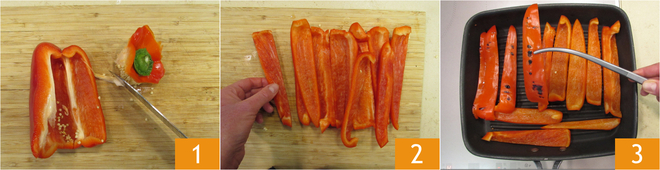 Para preparar o sanduíche com atum, vegetais grelhados e stracciatella, limpe 1 e corte o pimentão em tiras de cerca de 2-3 cm 2. Aqueça bem a grelha e cozinhe os pimentões por cerca de 8-10 minutos de ambos os lados até que fiquem macios, mas não excessivamente cozidos 3.