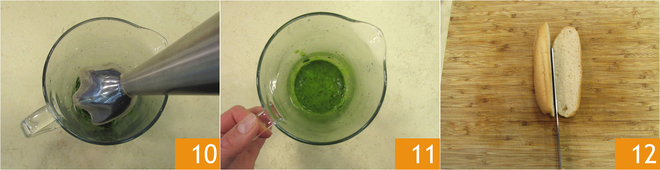 Bata com o mixer de imersão 10 para obter um molho homogêneo 11. Corte as mini baguetes ao meio 12.