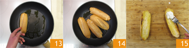 Coloque um fio de óleo evo na frigideira e aqueça as mini baguetes 13 14. Assim que as baguetes estiverem douradas, retire do fogo e coloque sobre uma tábua, prontas para serem recheadas! Espalhe a stracciatella 15.
