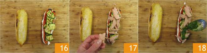 Recheie com os vegetais grelhados 16 e o atum 17. Complete com o molho verde 18 e sirva imediatamente o sanduíche com atum, vegetais grelhados e stracciatella.