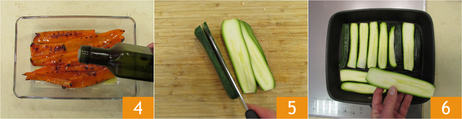 Transfira o pimentão para uma travessa e tempere com óleo e sal 4. Corte as abobrinhas em tiras finas de cerca de ½ cm 5. Cozinhe também as abobrinhas na grelha quente por cerca de 5 minutos de cada lado 6.
