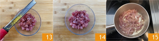 Adicione uma primeira parte de água 10. A quantidade de água será relativa ao tamanho da panela; em qualquer caso, você poderá adicionar mais, se necessário. No total, levará 10 minutos para cozinhar as cebolas. Enquanto isso, corte o atum previamente congelado em cubos 11.