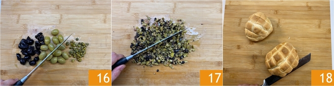 Transfira para uma tábua os dois tipos de azeitonas e as alcaparras dessalgadas 16, pique com uma faca até obter uma mistura homogênea 17. Agora, monte os sanduíches. Primeiro, corte os dois pãezinhos ao meio 18.