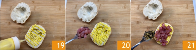 Coloque na base do pão a maionese 19, em seguida o atum 20 e a mistura de alcaparras e azeitonas 21.