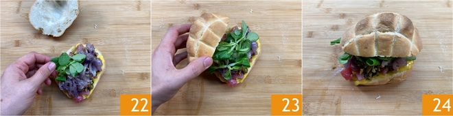 Adicione as cebolas e o agrião 22, feche o sanduíche 23 e sirva 24!