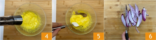 Adicione sal e pimenta 4, misture com uma espátula 5 e reserve na geladeira. Limpe as cebolas e corte-as em fatias 6.