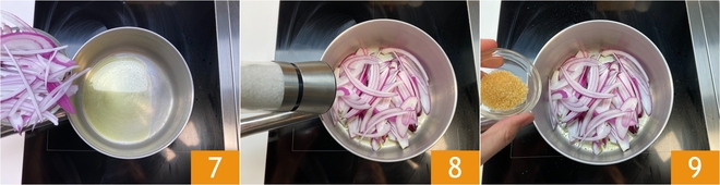 Em uma panelinha, despeje o óleo e aqueça-o. Adicione as cebolas 7, o sal 8 e o açúcar mascavo 9.