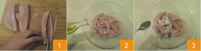 Para preparar o sanduíche com frango temperado e beterraba, primeiro limpe o peito de frango removendo a cartilagem e ossinhos, depois corte-o em tiras com meio centímetro de espessura 1. Transfira o frango para uma tigela e tempere com o óleo 2, o sal e o orégano 3.