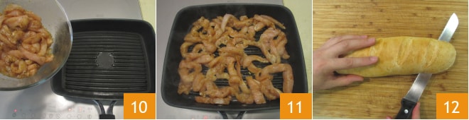Vá para o cozimento do frango: aqueça bem uma grelha, adicione as tiras de frango 10 e cozinhe por cerca de 6 minutos, virando-as frequentemente 11. O frango deve cozinhar muito bem, portanto, se necessário, você pode prolongar o tempo de cozimento. Enquanto isso, divida os pães ao meio no sentido do comprimento 12.