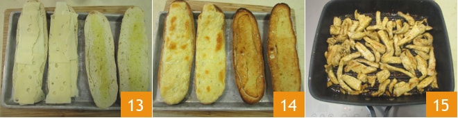 Tempere 2 fatias com óleo e 2 fatias com 50 g de Emmental cada 13, depois asse em modo grill a 250° por 4 minutos ou pelo tempo necessário para derreter o queijo 14. Quando o frango estiver cozido 15, vocês estão prontos para montar seus sanduíches.