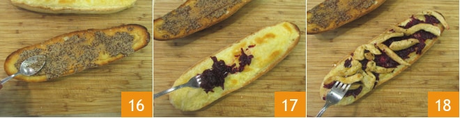 Passe a mostarda em grãos nas fatias de pão sem queijo 16. Recheie as fatias restantes de pão com a beterraba temperada 17 e o frango temperado 18.