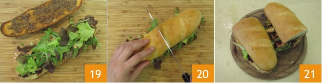 Adicione um punhado de salada mista 19 e feche os sanduíches, depois corte-os ao meio 20. Seus sanduíches com beterraba e frango temperado estão prontos para serem saboreados 21!