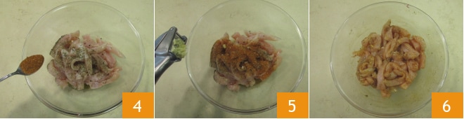 Adicione também a páprica 4, a pimenta e o dente de alho amassado 5, depois misture bem 6, cubra com filme plástico e reserve por enquanto.