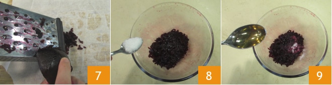 Rale a beterraba pré-cozida com um ralador de furos grandes 7, transfira para uma tigela e tempere com o sal 8, o óleo e o vinagre 9. Misture bem e reserve.