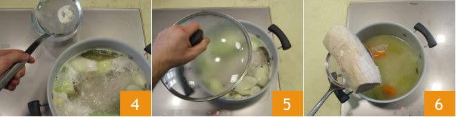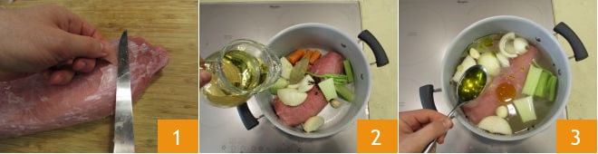 Para preparar os sanduíches de panetone é necessário carne restante. Nós usamos o girello do Vitello tonnato. Se quiser prepará-lo especialmente, basta limpar a carne de cartilagens e filamentos 1, depois colocá-la em uma panela junto com os legumes limpos e cortados. Adicione louro, cravos-da-índia e grãos de pimenta-do-reino. Despeje o vinho 2, a água, o sal e o óleo e aqueça no fogo 3.