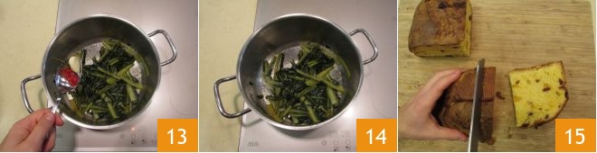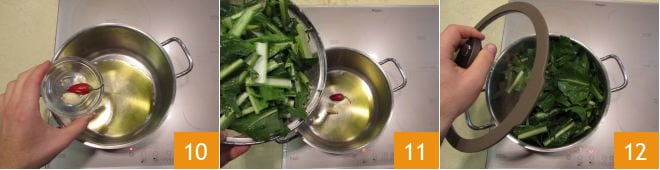 Em uma panela grande, coloque um fio de óleo, adicione alho e pimentão e aqueça em fogo alto 10. Em seguida, mergulhe os pedaços de chicória 11 e escalde por alguns instantes antes de ajustar o sal, cobrir com a tampa e deixar cozinhar em fogo baixo por meia hora. Lembre-se de mexer de vez em quando e verificar se não está grudando no fundo: se a água tiver secado completamente, adicione um pouco mais 12.