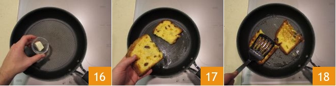 Então, aqueça bem uma frigideira antiaderente, deixe derreter uma colher de manteiga 16 e depois toste as fatias de pão por cerca de um minuto de cada lado 17. Pressione delicadamente com a espátula e repita com todas as fatias 18.