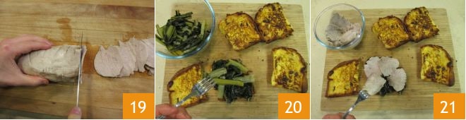 Agora que todos os ingredientes estão frios, fatie o pedaço de carne o mais fino possível 19: obtenha cerca de 3 – 4 fatias por sanduíche, calculando aproximadamente 50 gramas por peça. Prossiga com a montagem. Em uma fatia de panetone torrado, disponha a chicória 20, a carne 21,