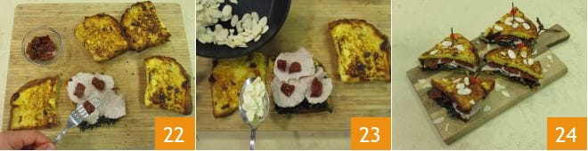 alguns tomatinhos secos no óleo escorridos 22 e algumas lâminas de amêndoas torradas na frigideira 23. Feche com a fatia de panetone similar e repita para todos. Seus sanduíches de panetone estão prontos, agora é só saboreá-los, se quiser, dividindo-os em duas partes 24!