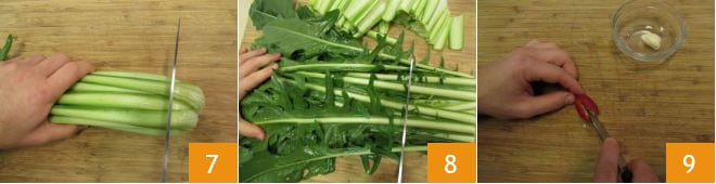 Enquanto isso, cuide da chicória. Depois de remover a base 7, corte em pedaços de cerca de 10 cm e depois lave bem 8. Em seguida, descasque o dente de alho, faça um corte em um pimentão e vá para o fogão 9.