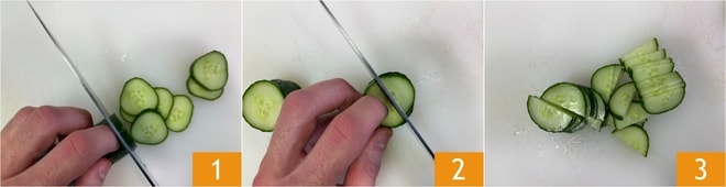Para preparar o sanduíche de pepino e queijo de cabra, comece cuidando dos pepinos: lave-os e corte-os em fatias bem finas 1. Corte então uma parte das fatias ao meio 2 e reserve-as 3.