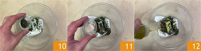 Adicione as ervas aromáticas secas (salsa, manjericão e cebolinha) 10, o alho em pó 11, o sal, a pimenta e, por fim, o azeite de oliva extra virgem 12.