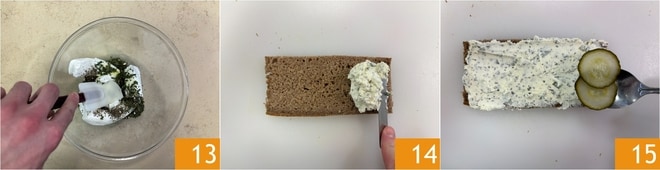 Misture bem tudo 13 e passe para a composição do sanduíche: espalhe generosamente uma fatia de pão com o creme de ervas 14, depois distribua os pepinos em rodelas 15.