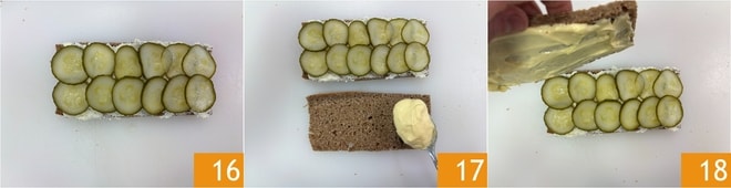 Coloque-as lado a lado para formar uma camada ordenada 16 e, em seguida, espalhe outra fatia com maionese 17. Sobreponha-a à outra com a parte espalhada de maionese voltada para baixo 18.