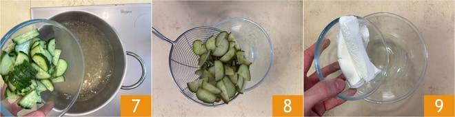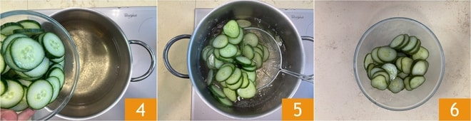 Leve a água para ferver com o sal e o vinagre e mergulhe as fatias de pepino 4. Após 1-2 minutos, escorra-as 5 e reserve-as 6.