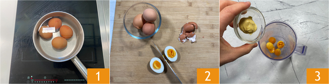 Para preparar a maionese japonesa, mergulhe 4 ovos em uma panela com água fria; a partir da fervura conte 10 minutos 1. Resfrie-os em água fria, depois descasque-os 2 e coloque no copo do mixer apenas as gemas e a mostarda 3. Use as claras em outras receitas.