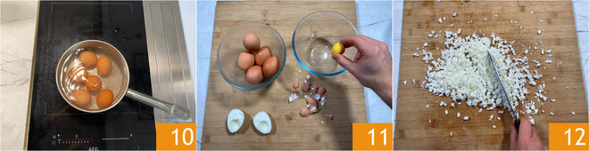 Passe para o preparo do sanduíche tamago. Mergulhe 6 ovos em uma panela com água fria, leve ao fogo até ferver e conte 10 minutos 10. Resfrie os ovos em água fria e depois descasque-os separando gemas e claras 11. Pique as claras grosseiramente com uma faca 12.